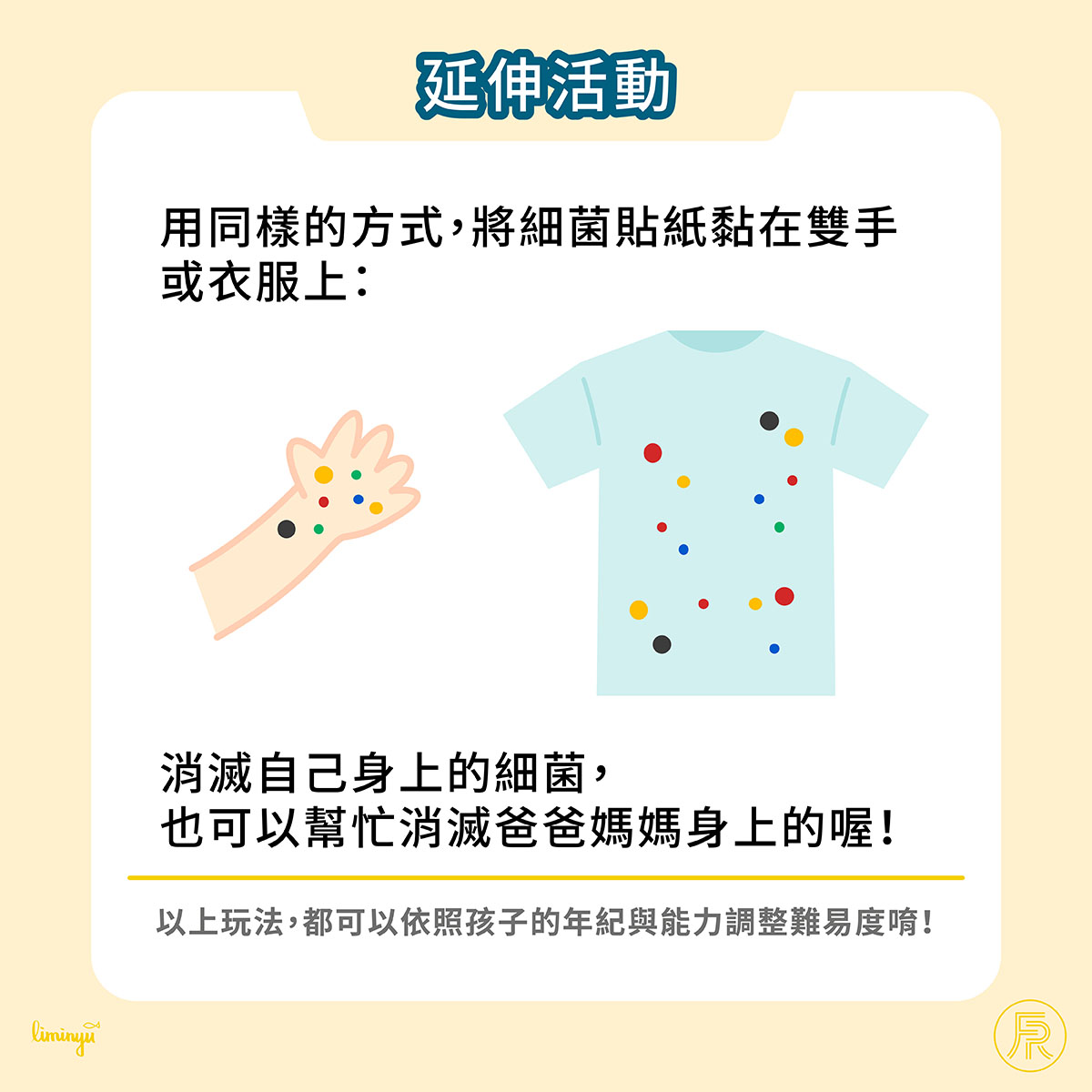 大多數孩子沒有「細菌病毒」、「傳染」的觀念,不知道戴口罩等防疫的重要性,讓家長擔憂又頭痛,不知如何讓孩子好好注意自身清潔… … 小賴老師在這裡提供一個居家親子互動小遊戲,以